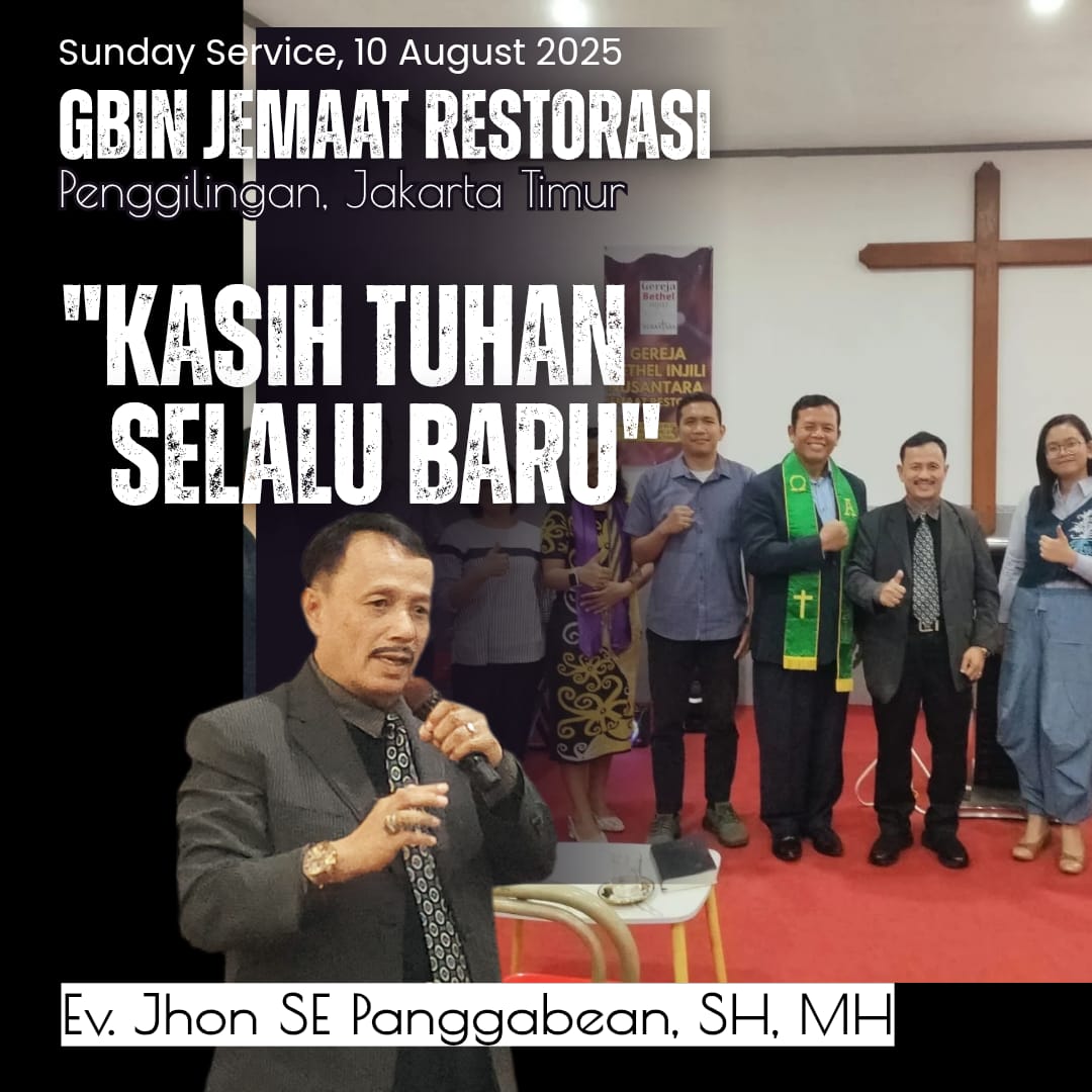 Jakarta,Victoriousnews.com—Di tengah kesibukannya sebagai seorang advokat ternama, Wakil Ketua Umum DPN Peradi SAI, Jhon SE Panggabean, SH, MH, kembali memenuhi panggilan hatinya untuk melayani Tuhan. Minggu pagi, 10 Agustus 2025, pukul 09.00 WIB, ia berdiri di mimbar Gereja Bethel Injili Nusantara (GBIN) Jemaat Restorasi, penggembalaan Pdt. Jeremias Panggabean, di Kompleks Perumahan Taman Pulo Indah, Penggilingan, Cakung, Jakarta Timur.