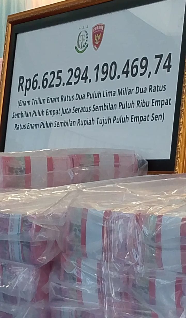 Pantauan tim media, Presiden hadir sekitar pukul 02.56 WIB. Presiden Prabowo Subianto mengenakan safari berwarna krem. Ia langsung menuju lobi Gedung Bundar Kejaksaan Agung untuk meninjau sejumlah uang yang digelar. Uang pecahan Rp100.000 terlihat masih baru dan terbungkus plastik rapi merupakan hasil denda dan sitaan. Uang sebanyak 6.625.294.190.469, 74 (Enam Triliun Enam Ratus Duapuluh Lima Miliar Duaratus Sembilanpuluh Empat Juta Seratus Sembilanpuluh Ribu Empat Ratus Enampuluh Sembilan Rupiah Tujuhpuluh Empat Sen) merupakan Hasil Penyelamatan Keuangan Negara dan Penagihan Denda Administratif dipajang setinggi sekitar 1,5 meter hingga memenuhi lobi Gedung Bundar.