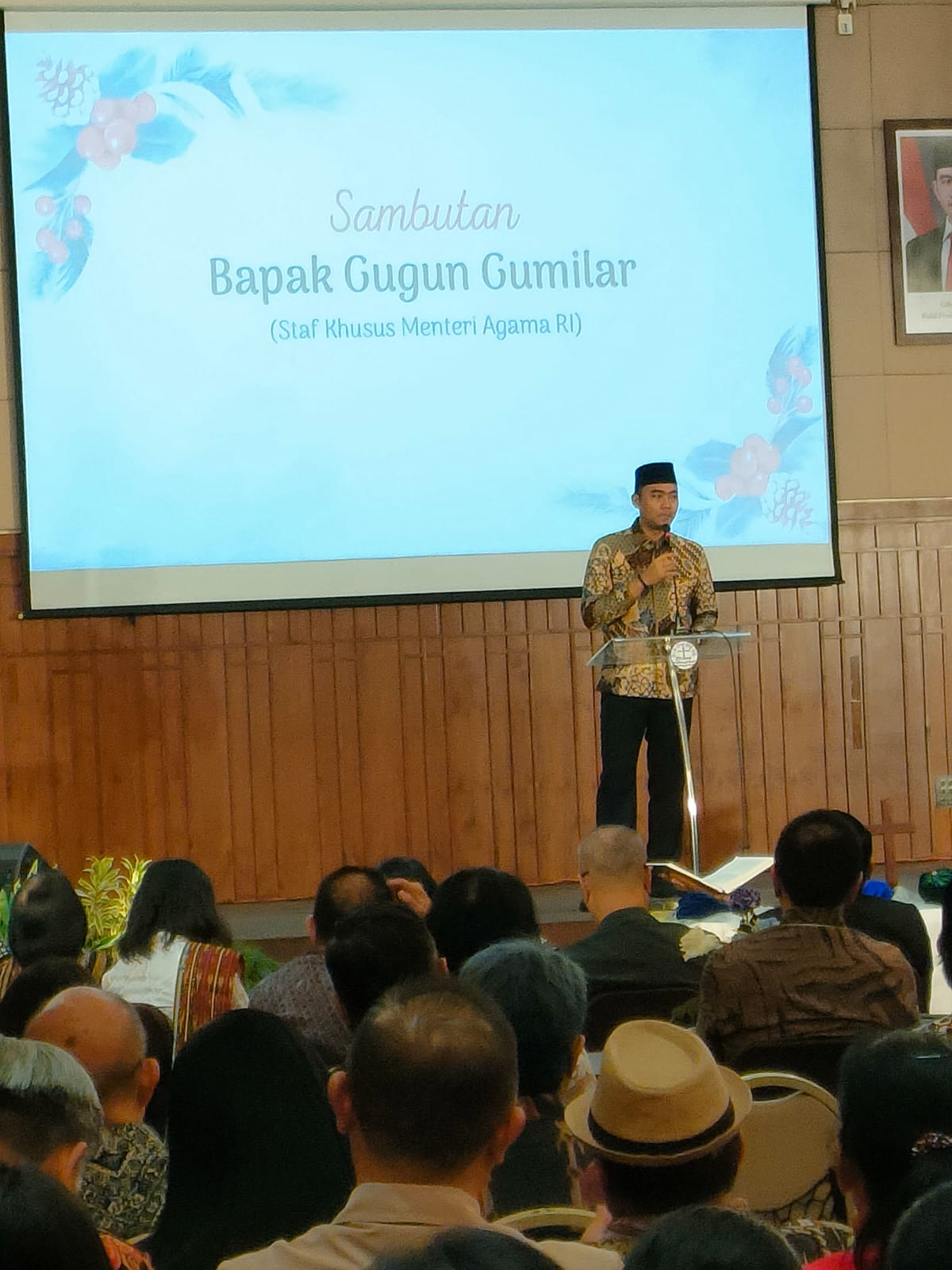 Ia menyampaikan salam dari Menteri Agama RI yang berhalangan hadir karena baru tiba dari perjalanan dinas. Dalam sambutannya, Gugun juga memperkenalkan latar belakang akademiknya sebagai Muslim yang menempuh studi teologi Kristen dan Islam di Amerika Serikat serta Inggris, dengan spesialisasi perbandingan agama. “Bagi saya, Islam dan Kristen adalah kemuliaan. Keduanya mengajarkan kasih, perdamaian, dan keselamatan,” tegasnya.